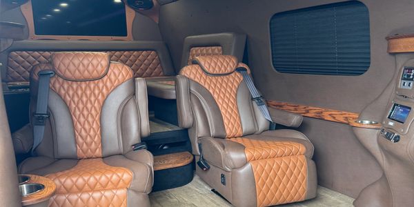 We offer three different styles of Mercedes Sprinter Vans. We have LIMO Style which is one long leather U-Shaped seat up to 10, & a SHUTTLE Style with 14 Forward Facing Seats, and out Most popular JET Style